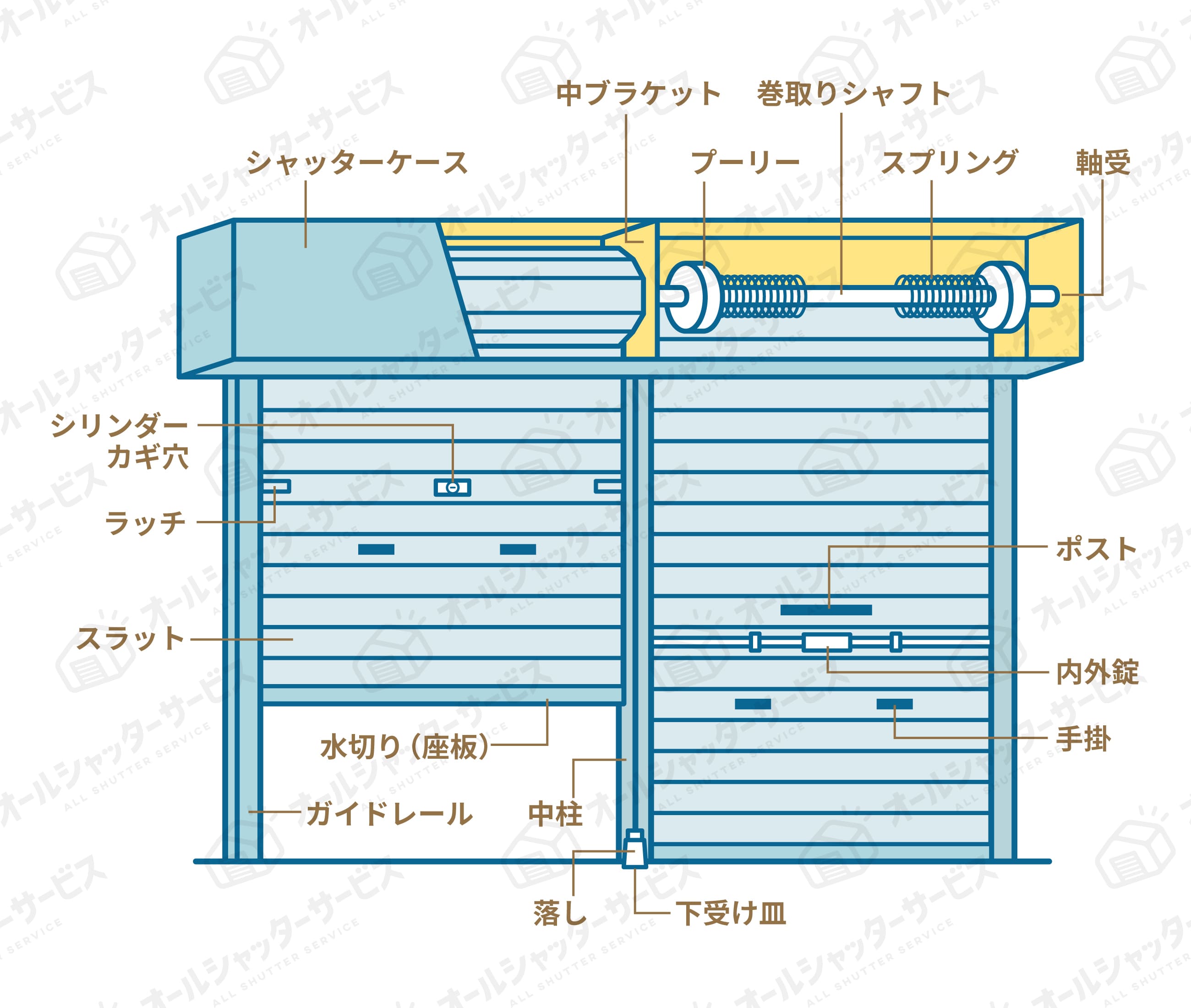 間口が広いシャッターは、1枚のスラットでは長さが足りないケースがあります。中柱を活用して2枚以上のスラットを連結することによって、スラットが曲がったり、ねじれたりするのを防いでくれます。シャッターケース